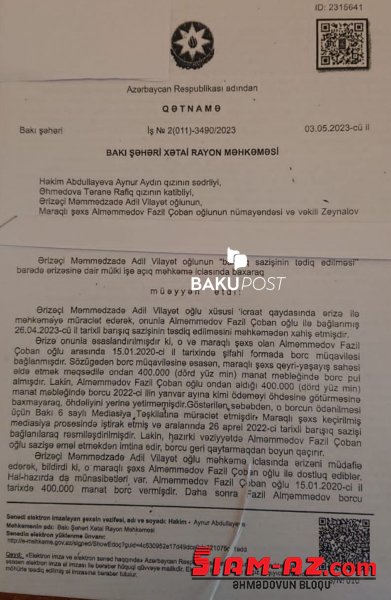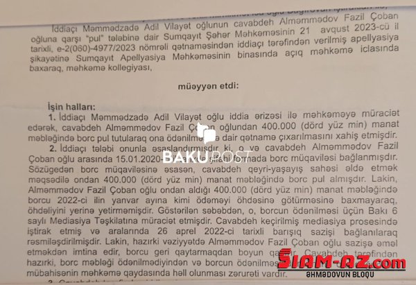 ”Yeni Gundem” Bakupost.az-a istinadən xəbər verir ki, Fazil Alməmmədov 2020-ci ildə obyekt almaq və biznes qurmaq adı ilə şifahi borc müqaviləsi ilə Adil Məmmədzadədən 400.000 min manat pul alıb. Lakin sonradan ortada nə biznes, nə obyekt olmadığından Adil Məmmədzadə pulunu geri tələb edib. Fazil Alməmmədov 2 il ərzində pulu ödəməyib. Qarşı tərəf prokurorluq orqanları və məhkəməyə müraciət edib. Bundna sonra Fazil Alməmmədov ona barışıq sazişi təklif edərək, tezliklə pulu qaytaracağına söz verib.
