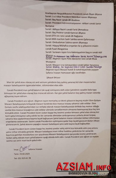 Fotoda Elşad SadıqovSəfərov İrzəxanın ölkə başçısına və bir çox dövlət qurumlarına , o cümlədən redaksiyamıza yolladığı şikayət ərizəsində daha çox diqqət çəkən məqam isə onun Masazır Bələdiyyəsinin qarşında intihar etmək mesajıdır.