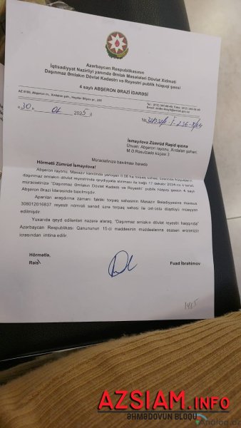 Səfərov İrzəxan Həmzəxan oğlu iddia edir ki, onun qanuni şəkildə aldığı torpaq sahəsini Masazır Bələdiyyəsi, Abşeron Rayon İcra Hakimiyyətinin Memarlıq şöbəsinin keçmiş müdiri Elvin Quliyevlə əlbir olub başqa şəxsə satıblar.