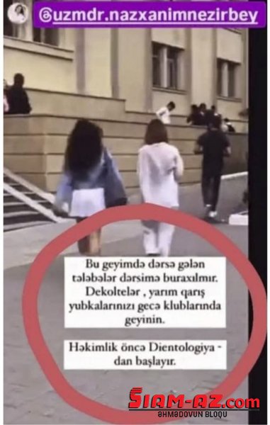 Xəbər verdiyimiz kimi, bir neçə gün bundan öncə Azərbaycan Tibb Universitetinin müəllimi Nazxanım Nəzirbəy (Qasımova) təhsil ocağının həyətində tələbələrin fotosunu çəkib. Pedaqoq şəklin üzərinə “Bu geyimdə dərsə gələnlər dərsimə buraxılmır. Dekoltelər, yarım qarış yubkalarınızı gecə klublarına geyinin. Həkimlik öncə dientologiyadan başlayır” sözlərini yazıb.Bundan sonra müəllim sosial şəbəkələrdə tənqid olunub. Maraqlıdır, tələbələrin ali təhsil müəssisəsinə necə geyinib gəlməsi ilə bağlı nizamnamə varmı? Bu, məktəblərdə olduğu kimi müəyyən qayda-qanunla tənzimlənirmi?