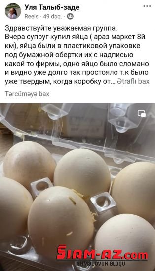 "Araz" marketlər şəbəkəsinin 8 km ərazisindəki filialından alınan yumurtalardan bu dəfə qurdlar çıxıb. Bakupost.az xəbər verir ki, Ülviyyə adlı alıcı plasmas qablaşmada olan 10 ədəd yumurtanı açanda birinin çatladığını görüb. Qutunu açanda ordan kəskin qoxu gəldiyini deyən alıcı gördüyü mənzərədən şoka düşüb. Həmin sınmış yumurta o qədər çox saxlanılıb ki, içini və üzərini ağ qurdlar basıb.