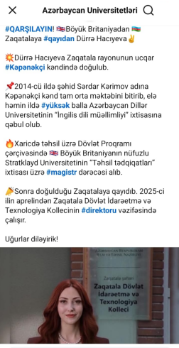 “Facebook” sosial şəbəkəsində “Azərbaycan Universitetləri” ilə 2025-ci ilin aprelindən Zaqatala Dövlət İdarəetmə və Texnologiya Kollecinin direktoru bağlı maraqlı paylaşım edilib.Bizimesr.az bildirir ki, paylaşımda qeyd olunur ki, Böyük Britaniyadan Zaqatalaya qayıdan Dürrə Hacıyeva Zaqatala rayonunun ucqar Kəpənəkçi kəndində doğulub. 2014-cü ildə şəhid Sərdar Kərimov adına Kəpənəkçi kənd tam orta məktəbi bitirib, elə həmin illərdə balla Azərbaycan Dillər Universitetinin “İngilis dili müəllimliyi” ixtisasına qəbul olub.