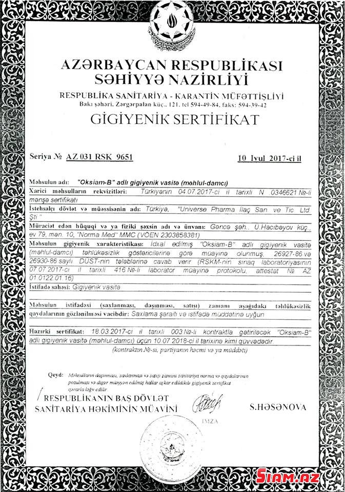 “Oksiam-B” dərman preparatı ölkə ərazisinə “Norma Med”MMC şirkəti tərəfindən idxal edilib və Səhiyyə Nazirliyinin müvafiq sertifikatı ilə təmin olunub.